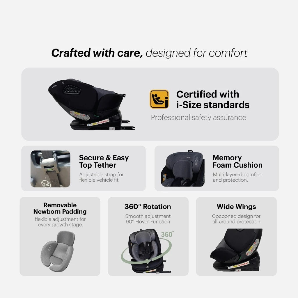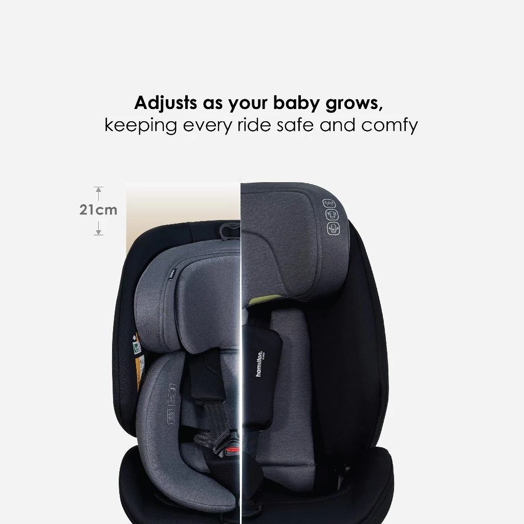 The Hamilton I-NEST 360° Rotatable Car Seat is thoughtfully designed to deliver maximum safety, superior comfort, and everyday convenience — from your baby’s very first ride home to their booster years.