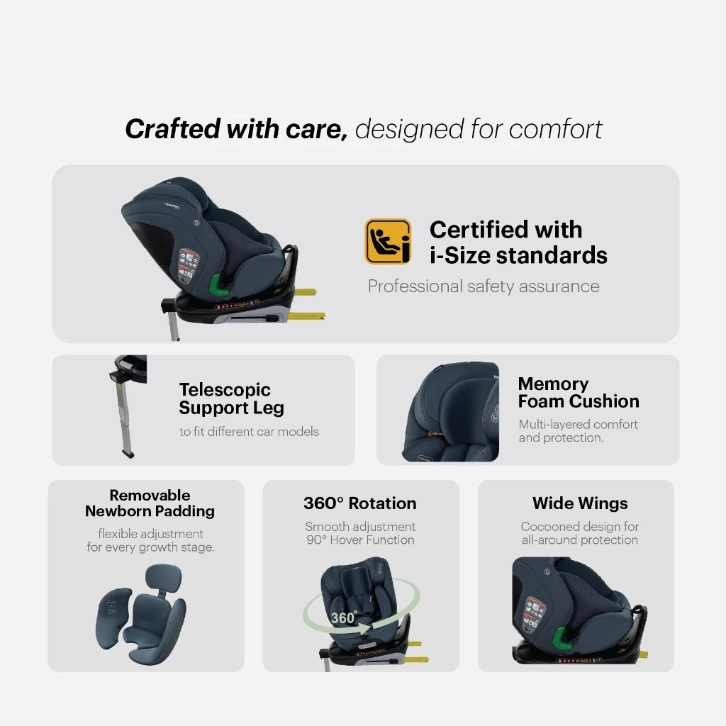 The Hamilton I-RIDE 360° Rotatable Car Seat is thoughtfully engineered to deliver maximum safety, everyday convenience, and long-term value—from newborn days right through to 12 years old (up to 150 cm).