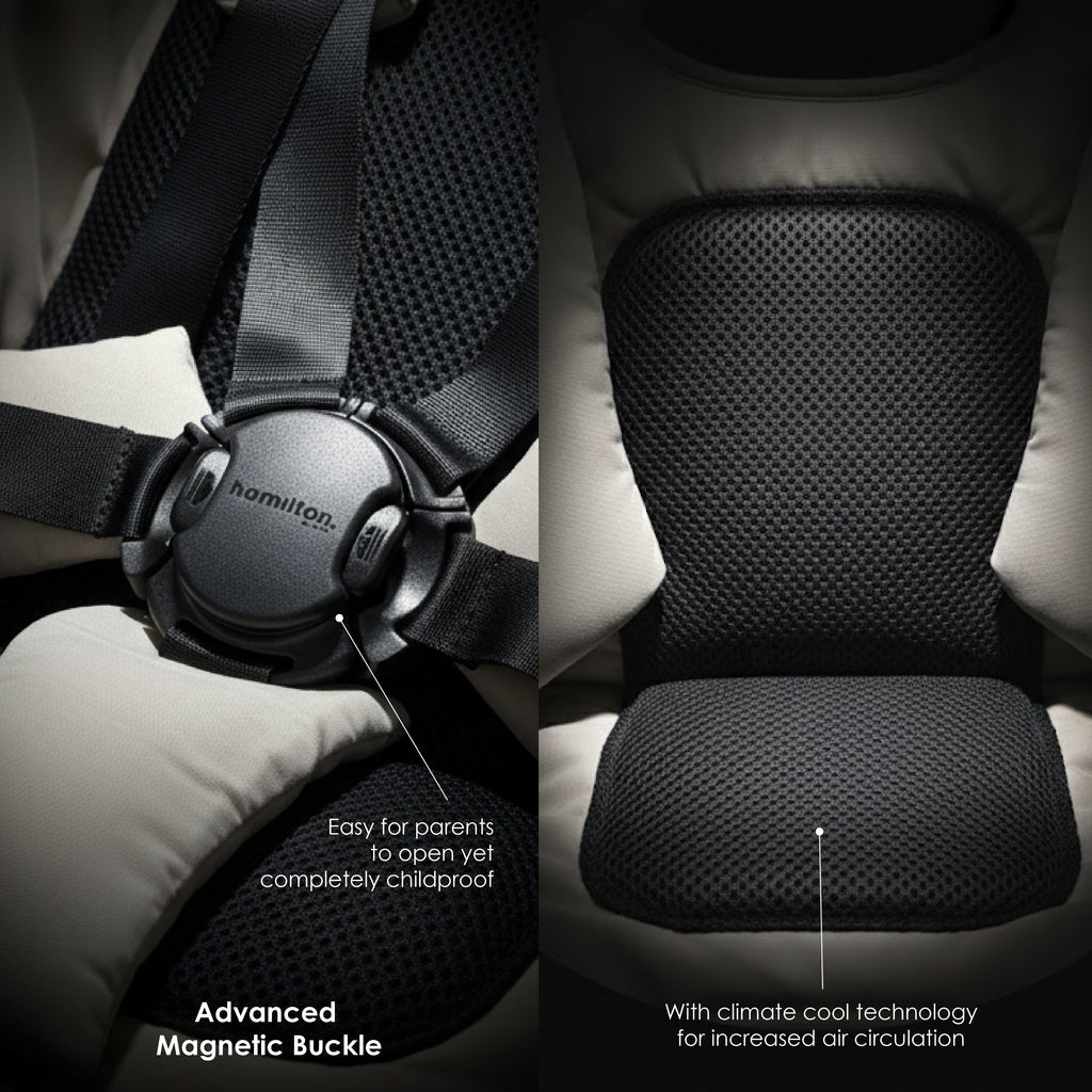 - Harness: Easy-adjust 5-point with magnetic buckle